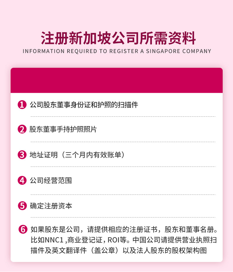5. 註冊資本:最低註冊資本為1新幣(低於1萬新幣,不需要驗資)。