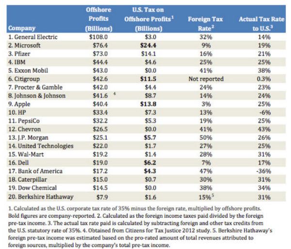 大多數(shù)的公司都并沒有提供如果它們將利潤遣返回國將會(huì)要負(fù)責(zé)承擔(dān)多少稅款估算。據(jù)該網(wǎng)站指出,前十家公司占有著68%的離岸利潤。一些高科技公司–微軟公司(Microsoft)、蘋果公司(Apple)和戴爾公司(Dell)–將其實(shí)際的外國稅率保持在低于10%的水平。
