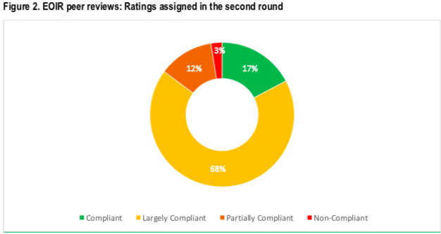 針對(duì)EIOR,全球論壇已經(jīng)完成了第一輪和第二輪的同儕評(píng)議(peer review),85%的司法管轄區(qū)都獲得了滿意的評(píng)議結(jié)果(合規(guī)或大體合規(guī)),只有12%的司法管轄區(qū)被評(píng)為“部分合規(guī)”,他們是:巴巴多斯、多米尼克、利比里亞、馬耳他和塞舌爾;其余3%(僅有安圭拉)為不合規(guī)。