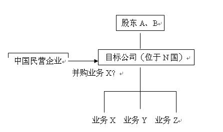 在此結(jié)構(gòu)中,中國(guó)民營(yíng)企業(yè)當(dāng)然可以以企業(yè)為股東在 N 國(guó)當(dāng)?shù)卦O(shè)立公司,來并購業(yè)務(wù) X 。但在將來,如果要對(duì)該當(dāng)?shù)毓具M(jìn)行任何運(yùn)作,均會(huì)涉及到中國(guó)及 N 國(guó)法律限制問題。同時(shí),目標(biāo)公司的兩個(gè)股東 A 鐘情于業(yè)務(wù) X ,仍希望進(jìn)行發(fā)展,而股東 B 則希望通過轉(zhuǎn)讓收取收益。如何實(shí)現(xiàn)呢?