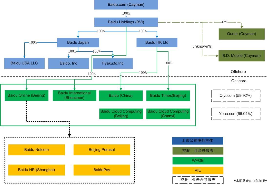 百度公司規(guī)模很大,但是沒有很復雜的組織結構,一看就懂。黃色的VIE公司只有4家,分別是從事搜索業(yè)務、人力業(yè)務和支付。