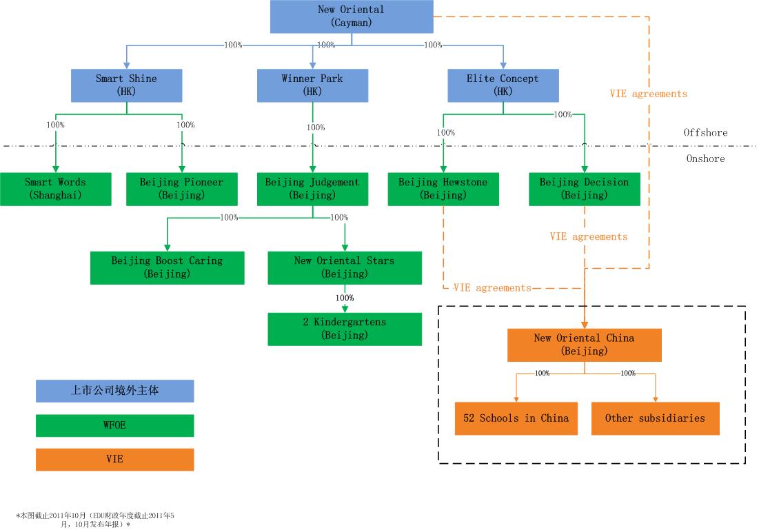 - 關于新東方的結構圖。本來20F上就已經有新東方的結構圖,但是看到你為了更加表明各個公司的性質,增加了一些自己的內容??墒窃谛聳|方結構圖里面,WFOE并沒有這么多家。很顯然,三家香港公司直接100%股權控制的公司是WFOE,但是這些WFOE下的公司卻不為WFOE,而是屬于外商投資境內再投資公司。這些再投資公司一般都不再享受外商投資企業(yè)的待遇,也不會有外商投資企業(yè)批準證書這一身份證明。所以將其歸為WFOE是不正確的。另外,可以看到在右下角橙色的VIE這塊,可能是由于為了圖示美觀的原因你省略了NEW ORIENTAL CHINA的股東這一塊。一般來說,VIE協(xié)議控制里面,VIE的股東是協(xié)議控制中必不可少的一部分,因此省略了原來20F里面的股東這塊,會讓圖示看起來有點怪。