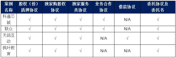 《業(yè)務(wù)合作協(xié)議》的主要內(nèi)容為確保WFOE對OPCO內(nèi)部制度和人員的控制條款,以及OPCO的一系列不作為承諾(主要包括不得從事與過往經(jīng)營不一致的業(yè)務(wù)活動,不得擅自進(jìn)行重大重組、收購或投資,不得擅自融資貸款或?qū)ν馓峁?dān)保等)。在部分案例中該等內(nèi)容可能被整合于獨家服務(wù)類協(xié)議中(如楓葉教育),但也有部分案例單獨另行簽署此類協(xié)議(如科通芯城和聯(lián)眾);
