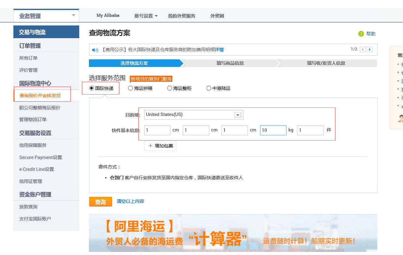 進入“查詢報價并安排發(fā)貨”,我們這里選擇國際快遞,以美國為例,選擇一個10kg的包裹