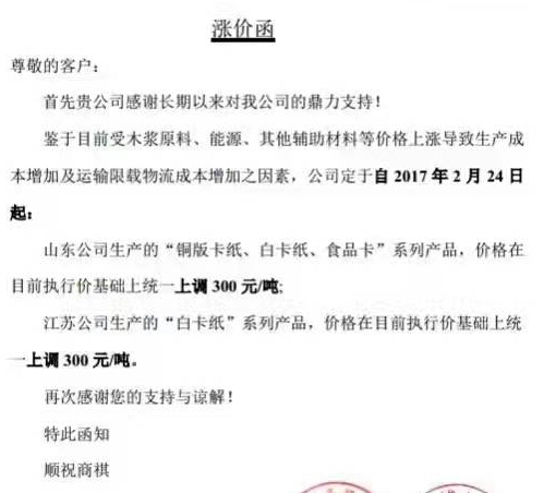 山東公司生產(chǎn)的“銅版卡紙、白卡紙、食品卡”系列產(chǎn)品,價格在目前執(zhí)行價基礎(chǔ)上統(tǒng)一上調(diào)300元/噸;