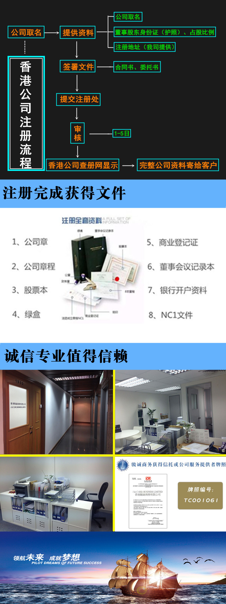 李:香港公司注冊流程簡單,一般委托代理注冊,香港駿誠是香港注冊處認(rèn)可的擁有“信托和公司服務(wù)代理人”秘書牌照,是正規(guī)合法經(jīng)營的老牌香港公司代理。注冊香港公司流程大致為: