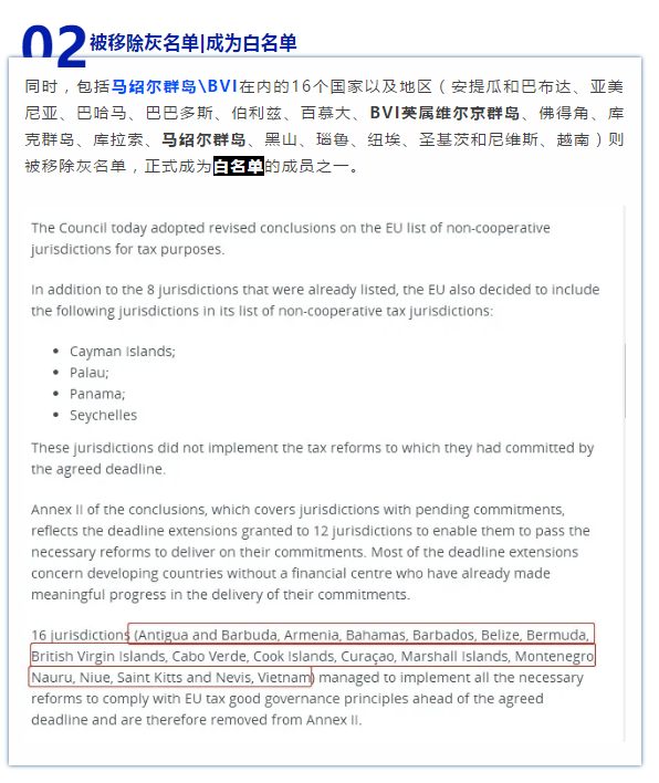 馬紹爾群島\BVI在內(nèi)的16個(gè)國(guó)家以及地區(qū)(安提瓜和巴布達(dá)、亞美尼亞、巴哈馬、巴巴多斯、伯利茲、百慕大、BVI英屬維爾京群島、佛得角、庫(kù)克群島、庫(kù)拉索、馬紹爾群島、黑山、瑙魯、紐埃、圣基茨和尼維斯、越南)則被移除灰名單,正式成為白名單的成員之一。