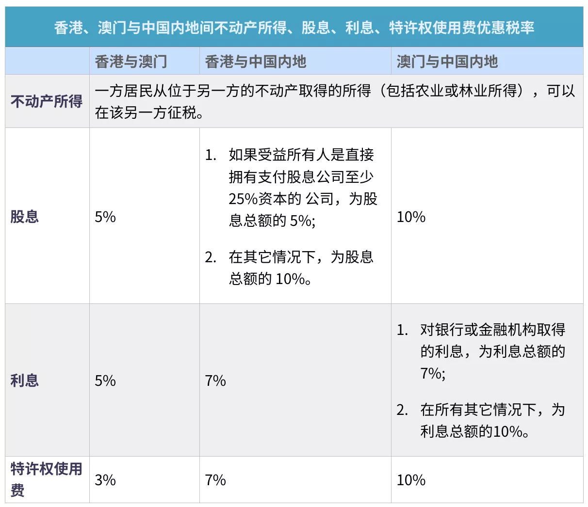 具體到香港和澳門之間,在DTA下,還可以享受其他優(yōu)惠安排,比如: