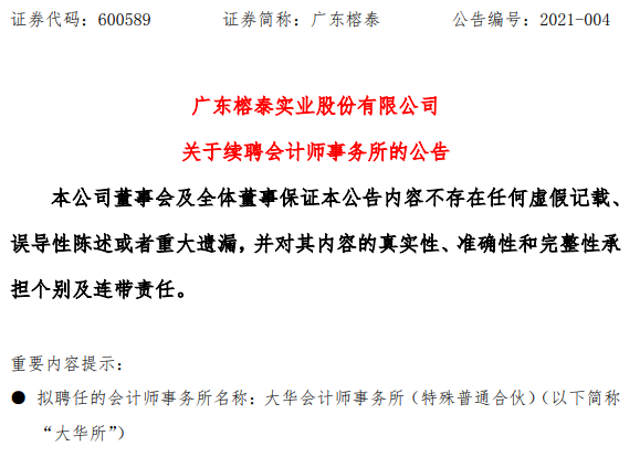 而廣東榕泰雖然指責審計師大華所時毫不留情,卻并未因此而辭退對方,而是在不久后發(fā)布公告稱續(xù)聘這家“未能勤勉盡責的”會計師事務所。續(xù)聘公告如下: