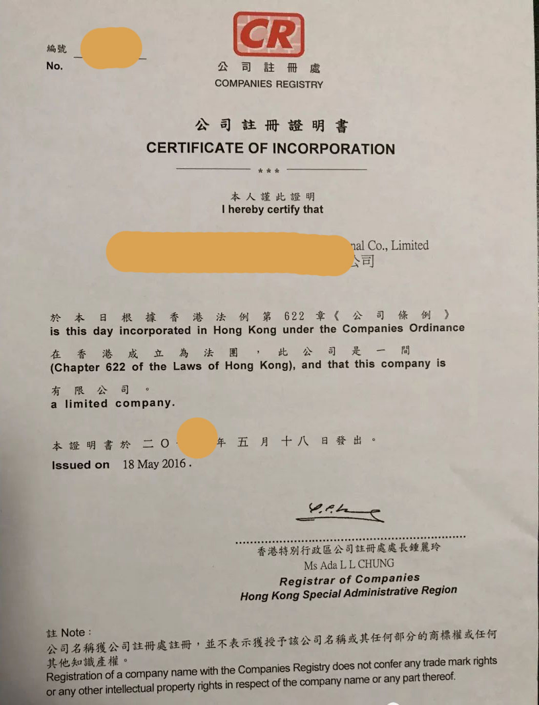 通常成立香港公司后所得到的全套資料如下: 1、商業(yè)登記證(BUSINESS REGISTRATION CERTIFICATE) 2、注冊證書(CERTIFICATE OF INCORPRATION) 3、法團成立表格NNC1 4、一套章程 5、鋼印一枚、條形答