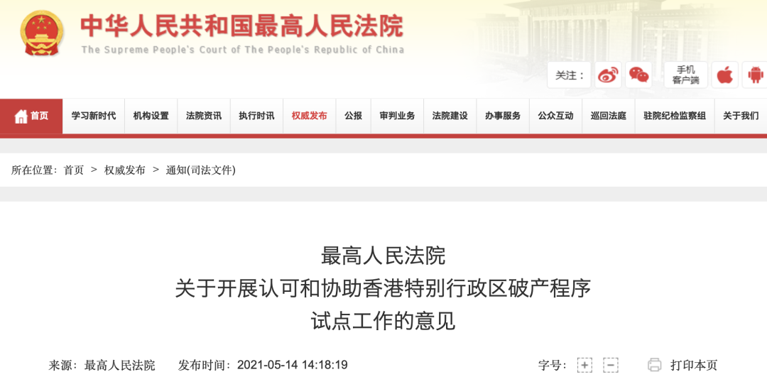 - 由最高人民法院發(fā)布的《關于開展認可和協(xié)助香港特別行政區(qū)破產程序試點工作的意見》(“《試點意見》”)