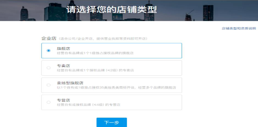 選擇用戶成功登錄后,進(jìn)入入駐選擇頁(yè)面,店鋪類(lèi)型有旗艦店、賣(mài)場(chǎng)型旗艦店、專(zhuān)賣(mài)店、專(zhuān)營(yíng)店。商家根據(jù)自身需要選擇入駐的店鋪類(lèi)型。不同入口需要上傳的資質(zhì)不同。
