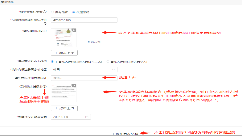 若商標(biāo)非開(kāi)店公司自有,品牌類(lèi)型請(qǐng)選擇代理品牌,并按照以下要求上傳資料: