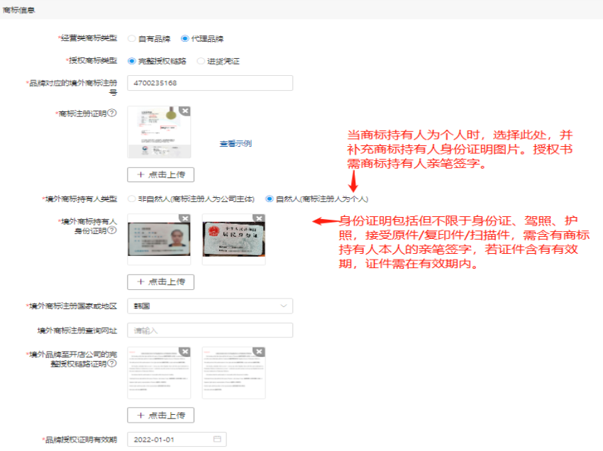 (1)選擇“代理品牌”,代理品牌類(lèi)型選擇“完整授權(quán)鏈路”。并提供該商標(biāo)的境外商標(biāo)注冊(cè)證書(shū)或商標(biāo)信息查詢截圖,以及商標(biāo)持有人到開(kāi)店公司的完整授權(quán)鏈路(5級(jí)以內(nèi))。當(dāng)商標(biāo)為個(gè)人所有,商標(biāo)持有人類(lèi)型請(qǐng)選擇“自然人”,并同時(shí)上傳經(jīng)商標(biāo)持有人簽字的持有人身份證明復(fù)印件/掃描件。