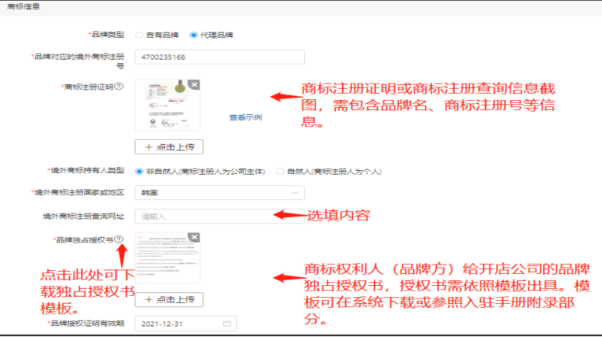 (1)需上傳境外35類(lèi)服務(wù)類(lèi)商標(biāo)注冊(cè)證明或商標(biāo)信息查詢截圖,以及35類(lèi)服務(wù)類(lèi)商標(biāo)持有人(品牌方)或總代理到開(kāi)店公司的獨(dú)占授權(quán)書(shū),授權(quán)書(shū)需按照入駐頁(yè)面或本入駐手冊(cè)附錄的模板出具。若由總代理授權(quán),需同時(shí)上傳品牌方到總代理的授權(quán)書(shū)。