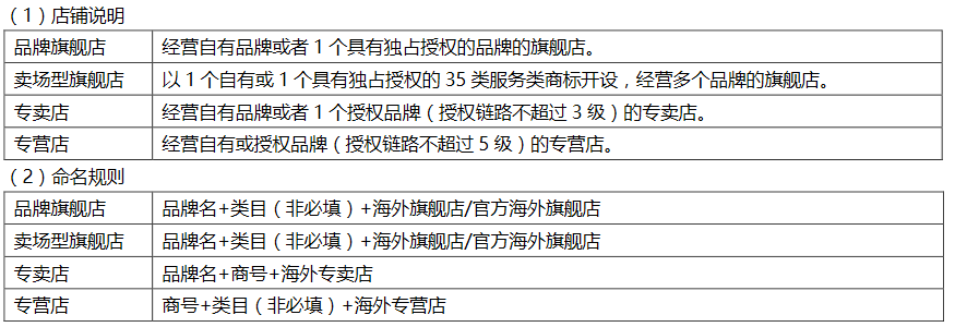 店鋪名稱(chēng)需按照以下規(guī)則進(jìn)行擬定。旗艦店、專(zhuān)賣(mài)店、專(zhuān)營(yíng)店命名格式如下: