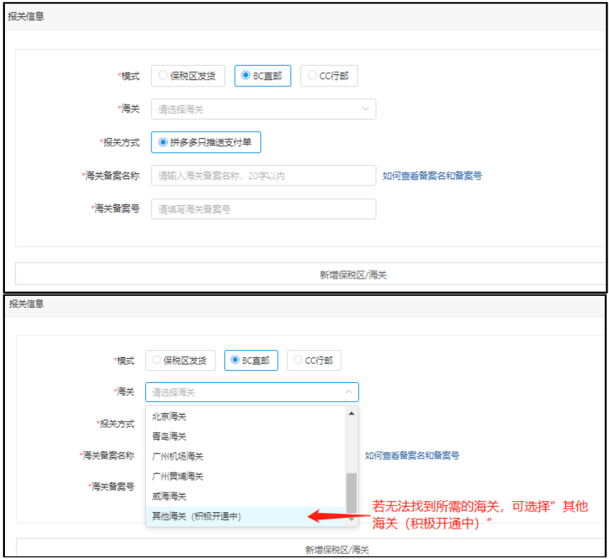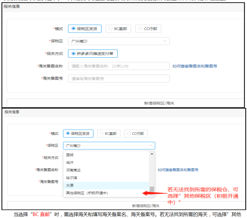 當(dāng)選擇“保稅區(qū)發(fā)貨”時(shí),需選擇保稅區(qū)和填寫(xiě)海關(guān)備案名、海關(guān)備案號(hào)。若無(wú)法找到所需的保稅倉(cāng),可選擇”其他保稅區(qū)(積極開(kāi)通中)”,并建議先與運(yùn)營(yíng)溝通核對(duì)具體保稅倉(cāng)的備案對(duì)接進(jìn)度,反饋內(nèi)部評(píng)估推進(jìn)。