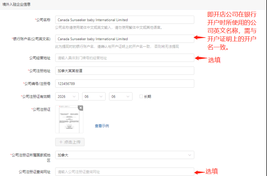 請(qǐng)上傳開(kāi)店公司(要求是境外公司)的公司注冊(cè)證明,接受原件、復(fù)印件或掃描件,并請(qǐng)如實(shí)填寫(xiě)開(kāi)店公司信息,帶“*”為必填內(nèi)容,“公司注冊(cè)證查詢網(wǎng)址”和“公司經(jīng)營(yíng)地址”為選填內(nèi)容。其中銀行賬戶名處需填寫(xiě)開(kāi)店公司在銀行開(kāi)戶時(shí)所使用的公司英文名稱(chēng),需與開(kāi)店公司的開(kāi)戶證明上的開(kāi)戶名一致。