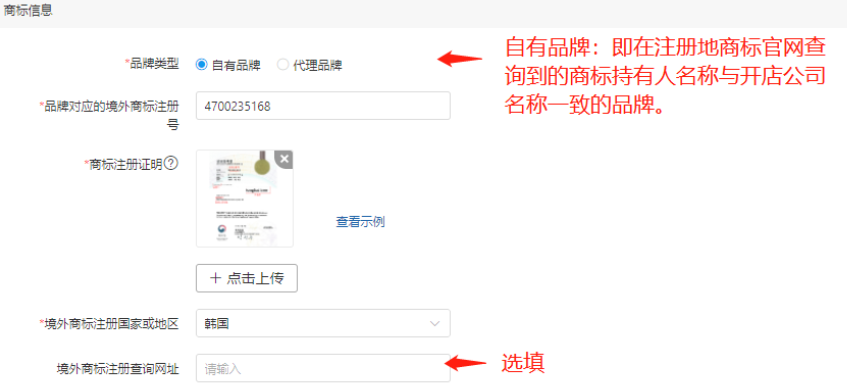 若商標(biāo)為開(kāi)店公司自有,品牌類(lèi)型請(qǐng)選擇“自有品牌”,并填寫(xiě)商標(biāo)注冊(cè)號(hào)和上傳境外商標(biāo)注冊(cè)證明或商標(biāo)信