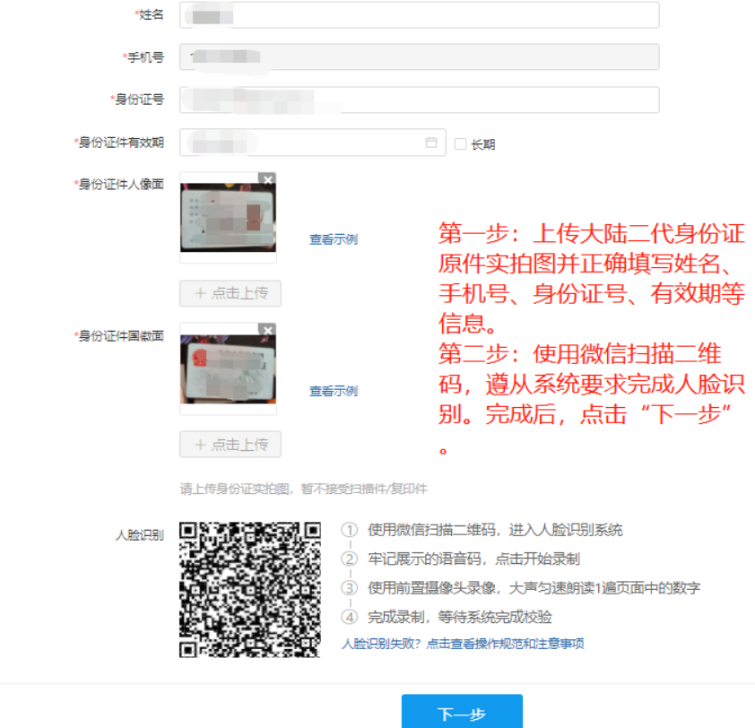 商家需在此處上傳店鋪管理人的中國(guó)大陸居民身份證圖片、填寫(xiě)身份證信息,并使用微信掃描二維碼完成人臉識(shí)別。管理人身份證圖片暫時(shí)只接受中國(guó)大陸居民身份證原件實(shí)拍圖片。完成后,請(qǐng)點(diǎn)擊”下一步“。
