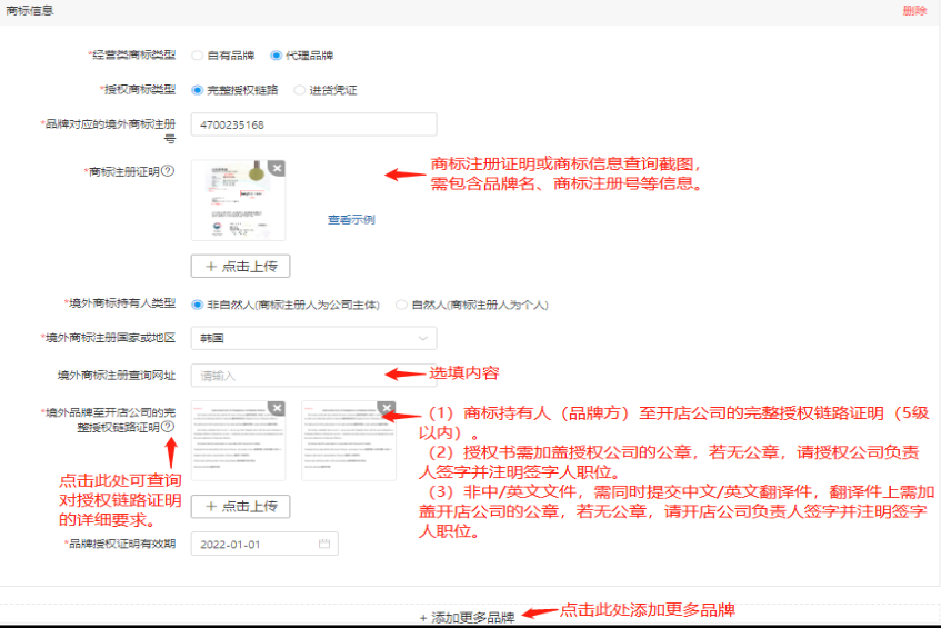 經(jīng)營(yíng)類(lèi)商標(biāo)需至少上傳1個(gè),點(diǎn)擊“添加更多品牌”進(jìn)行添加。