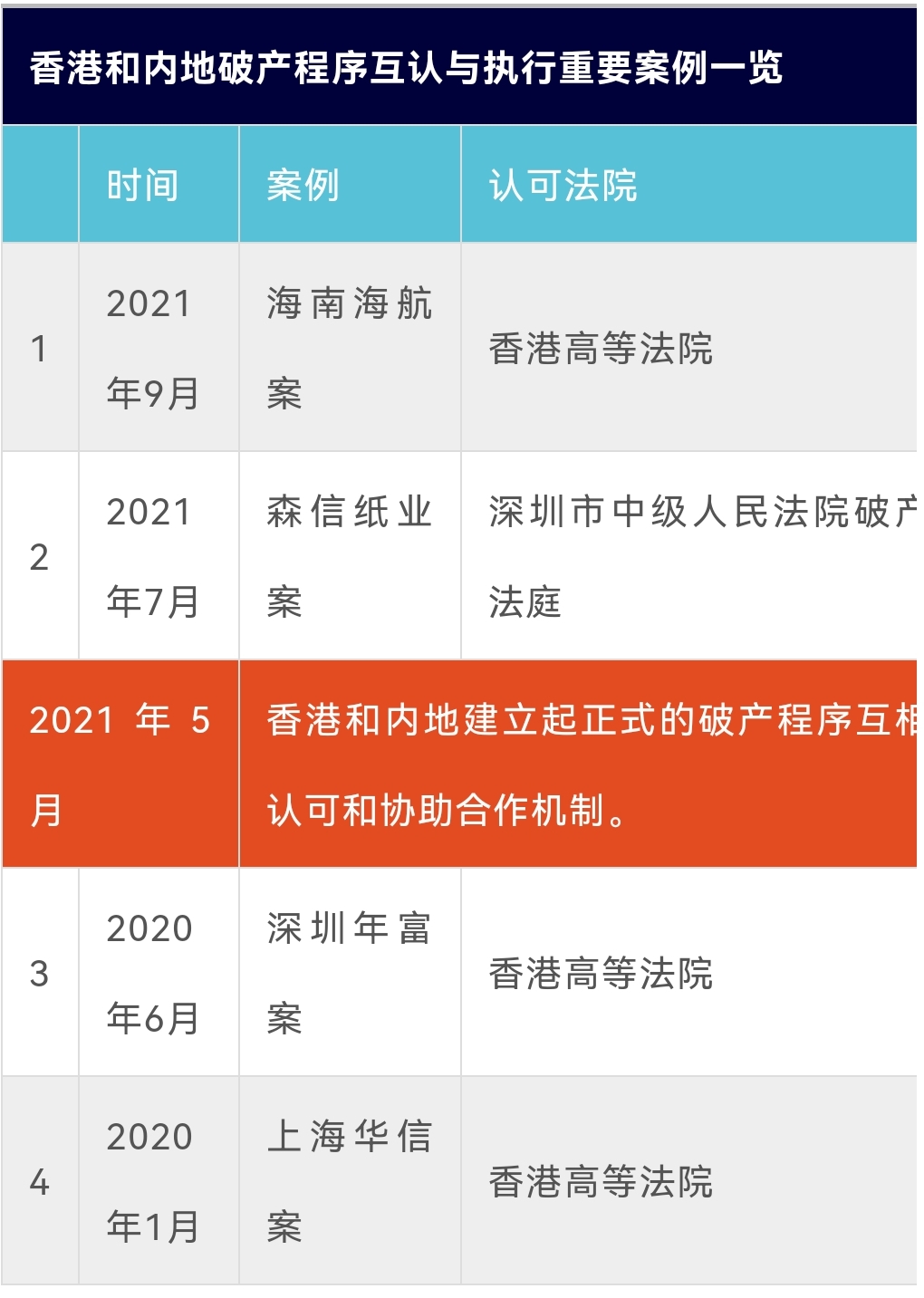 — 2021年7月20日,森信紙業(yè)有限公司(Samson Paper Company Limited)香港清盤人獲深圳市中級人民法院破產法庭的認可與協(xié)助,以處理內地資產。對此,我們在《內地與香港破產互認與協(xié)助第一案:「森信紙業(yè)」香港清盤人向深圳市破產法庭申請認可與協(xié)助!》一文有詳細介紹,您可點擊鏈接了解更多。