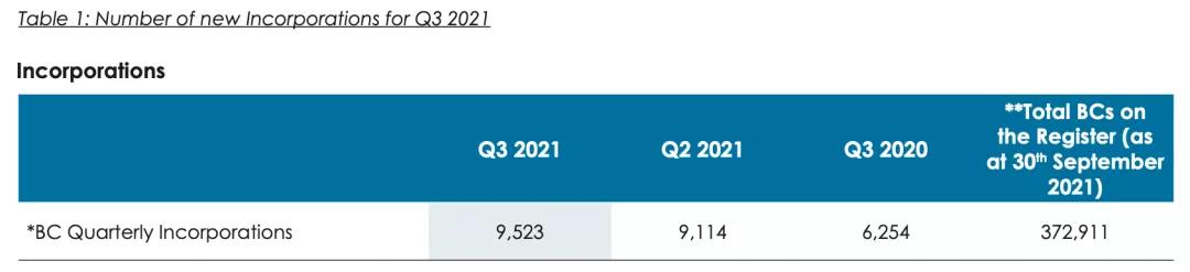 統(tǒng)計(jì)數(shù)據(jù)顯示,僅就最常見的BCs而言,其在第三季度的注冊(cè)數(shù)量為:9523家,同比2020年第三季度的6254家增幅高達(dá)近35%;即便與今年第二季度的9114家相比,仍然保持了4.49%的增長(zhǎng)態(tài)勢(shì)。