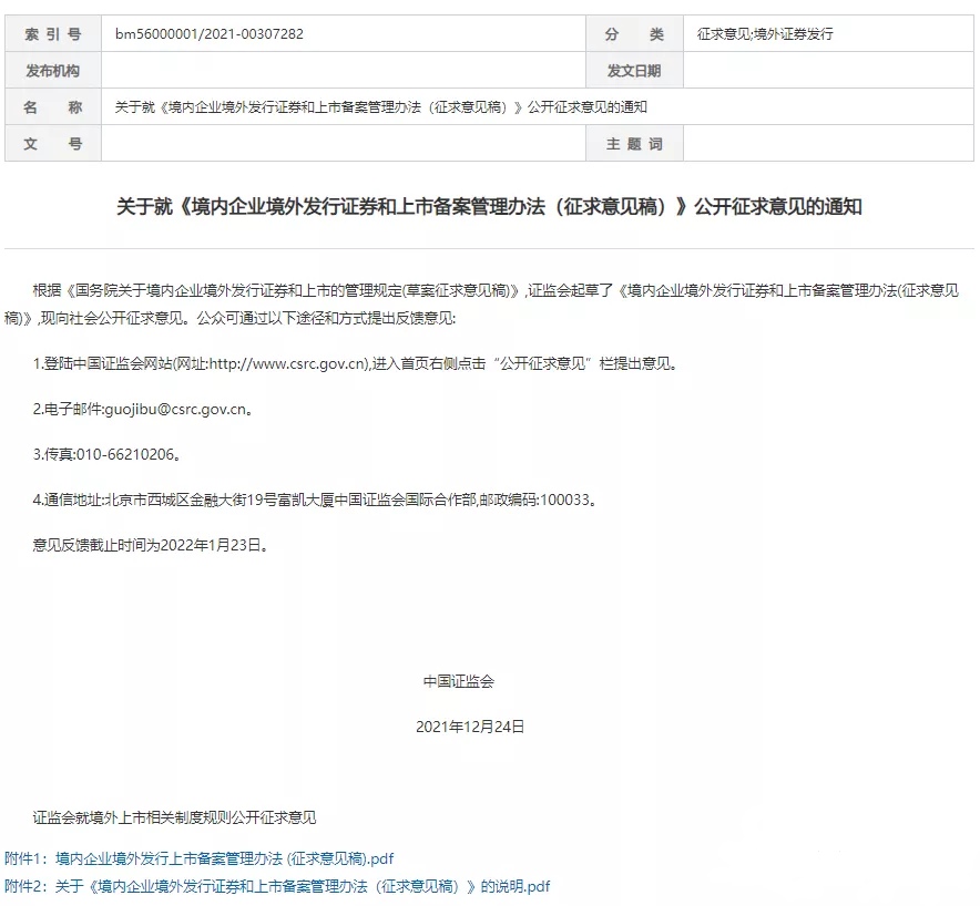 關(guān)于就《境內(nèi)企業(yè)境外發(fā)行證券和上市備案管理辦法(征求意見稿)》公開征求意見的通知