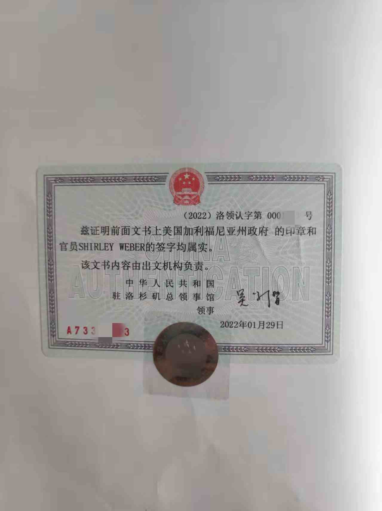 中國駐美國使館進行領事認證:只受理上兩級確認過之后的文件,不對文件內容負責,只是確認文件上公證律師和州務卿官員的簽字或蓋章的真?zhèn)巍?br />