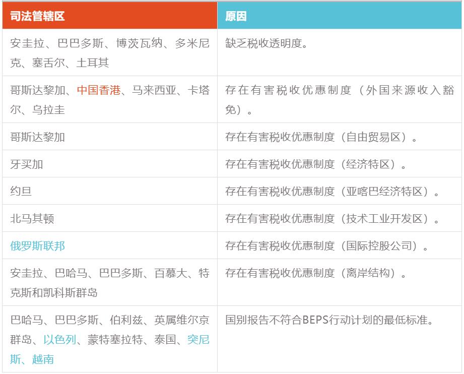 修訂后的歐盟稅收不合作轄區(qū)名單包括一份“黑名單”(附件一)和一份“灰名單”(附件二)。歐盟稅收不合作轄區(qū)“黑名單”沒有變化,仍然包括9個(gè)司法管轄區(qū),它們是:美屬薩摩亞、斐濟(jì)、關(guān)島、帕勞、巴拿馬、薩摩亞、特立尼達(dá)和多巴哥、美屬維爾京群島和瓦努阿圖。